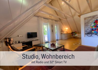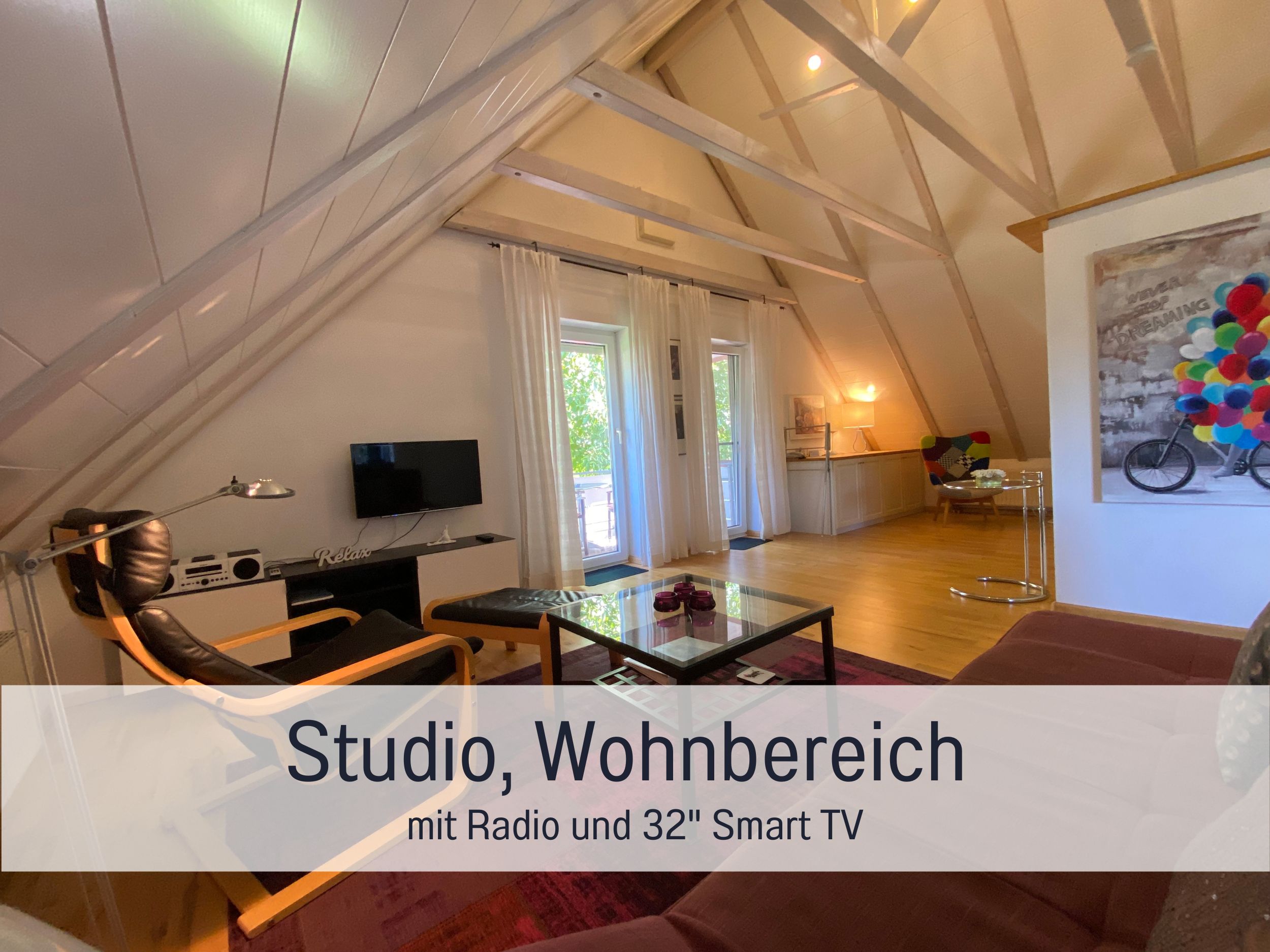 Durch die hohen Dachschrägen mit ganz besonderen Flair. Der Balkon ist Überdacht, und von unseren Gästen auch gerne „Vogelhaus“ genannt.